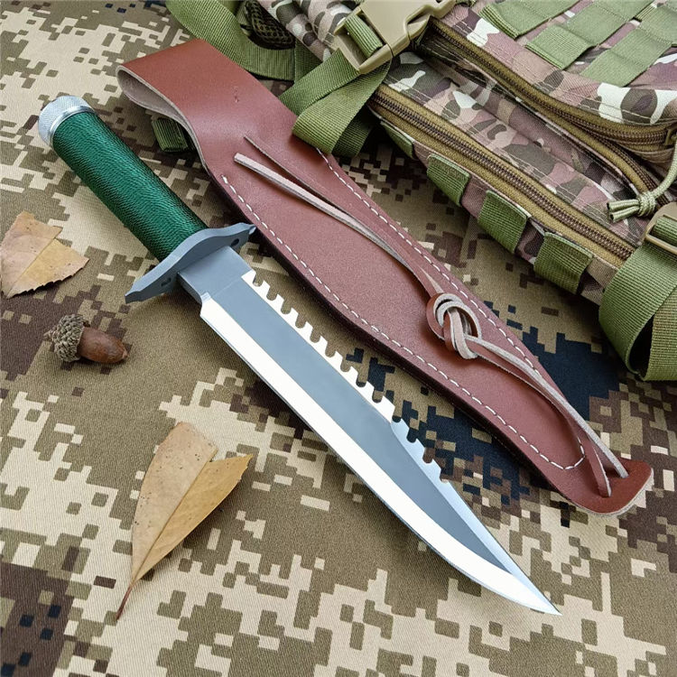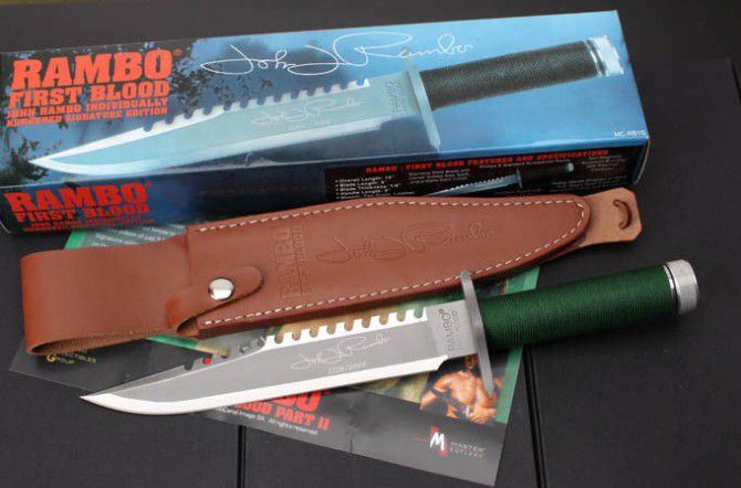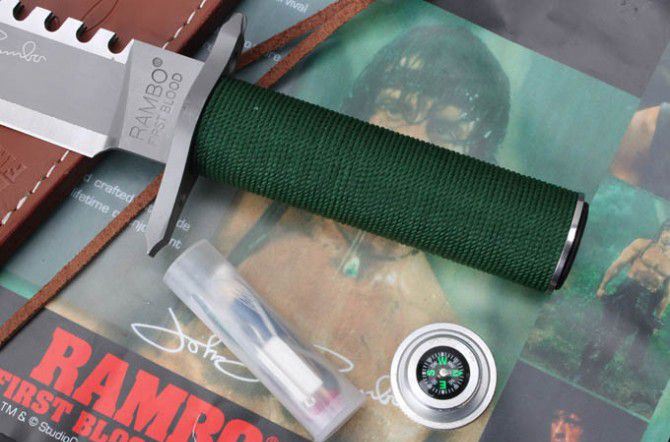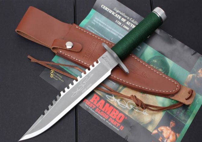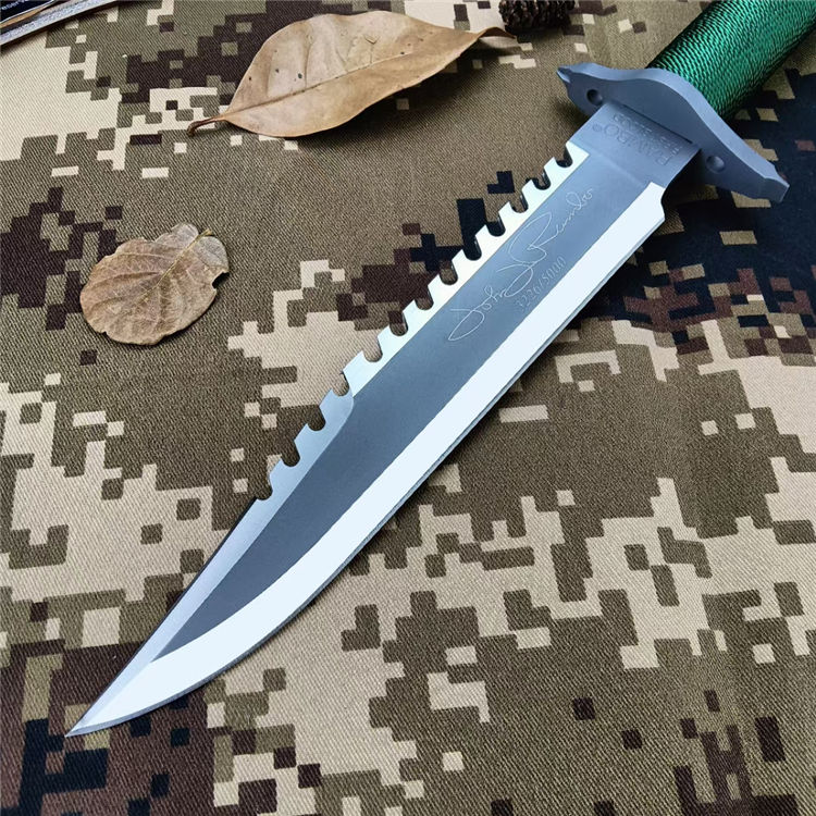 史泰龙(兰博1)手签版 全 长: 35cm 刃 长: 22.3cm 刃 厚: 5.9mm 刃 材: 440 硬 度: 58HRC 重 量: 410g 总 重: 710g 表 面: 钛离子 柄 材: 无缝钢管+细绳 刀 鞘: 牛皮