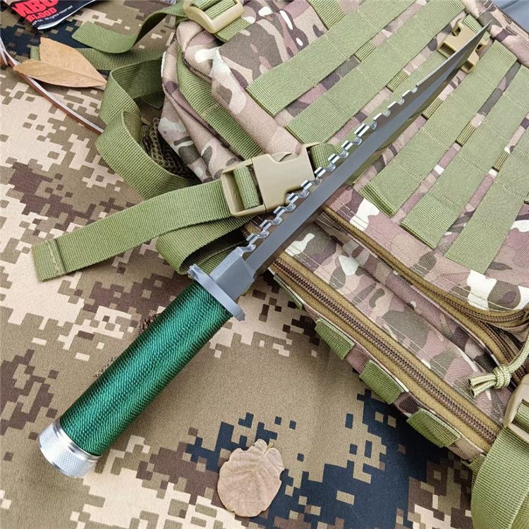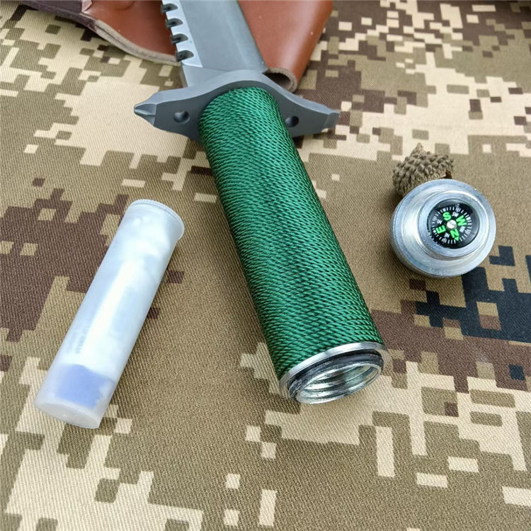 全 长: 35cm 刃 长: 22.3cm 刃 厚: 5.9mm 刃 材: 440 硬 度: 58HRC 重 量: 410g 总 重: 710g 表 面: 钛离子 柄 材: 无缝钢管+细绳 刀 鞘: 牛皮