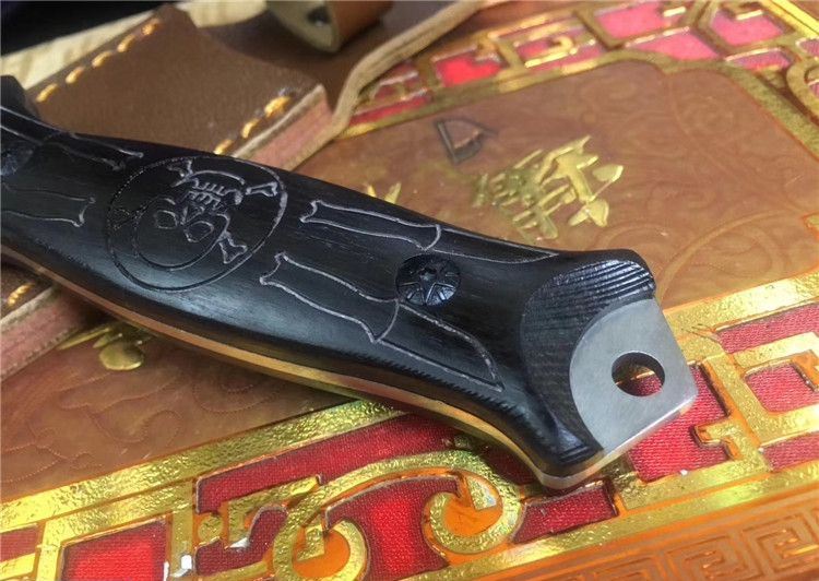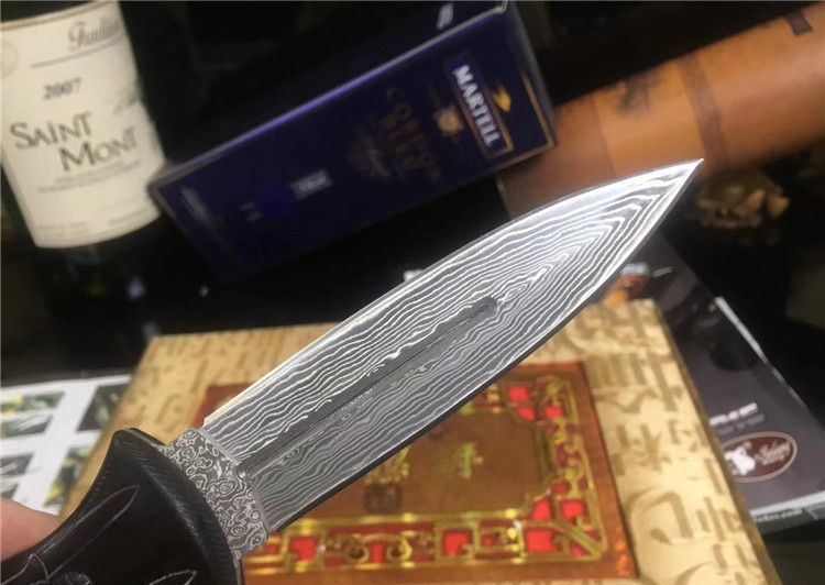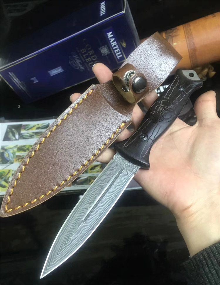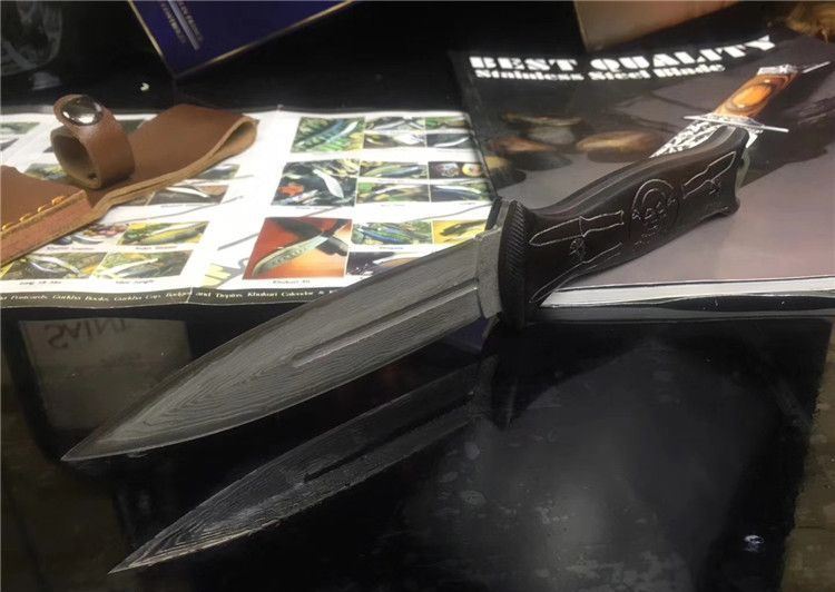 大马士革骷髅双刃收藏刀 全 长: 24.6cm 刃 长: 11.5cm 刃 宽: 2.6cm(最宽处) 柄 长: 12.6cm 刃 材: 大马士革 硬 度: 59 HRC 表 面: 电脑浮雕精美图案 刃 厚: 0.3cm 柄 材: 高档黑檀木 净 重: 160g 总 重: 220g 包 装:彩合 品 质: 品质卓越