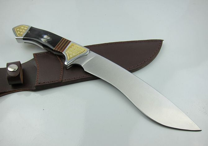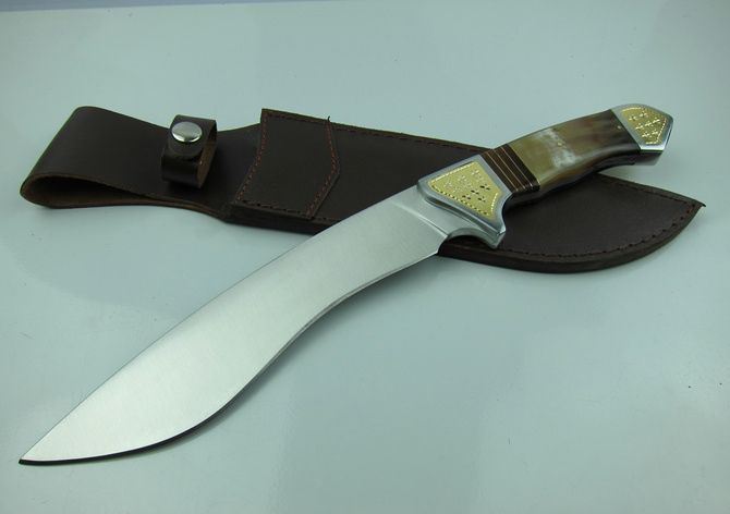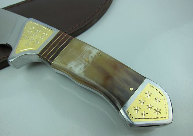 手工作狗腿弯刀 全长:36.2cm 刃长:20.1cm 柄长:15.2cm 刃宽: 5.5cm 刃厚:0.58cm 硬度区间:57HRC 全重:850g(含尼龙鞘和彩合) 刃材:440 表面:沙光 鞘材:真皮套套 柄材:钢头镶花纹铜片+牛角,制作工艺非常之高。 注:由于自然牛角每条色彩不同,要以实物为准.