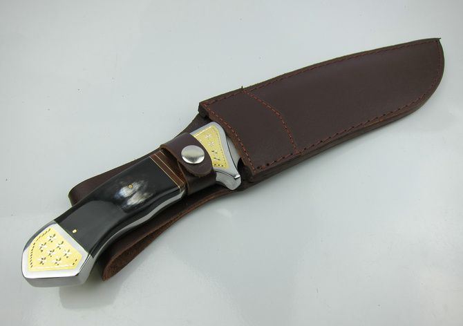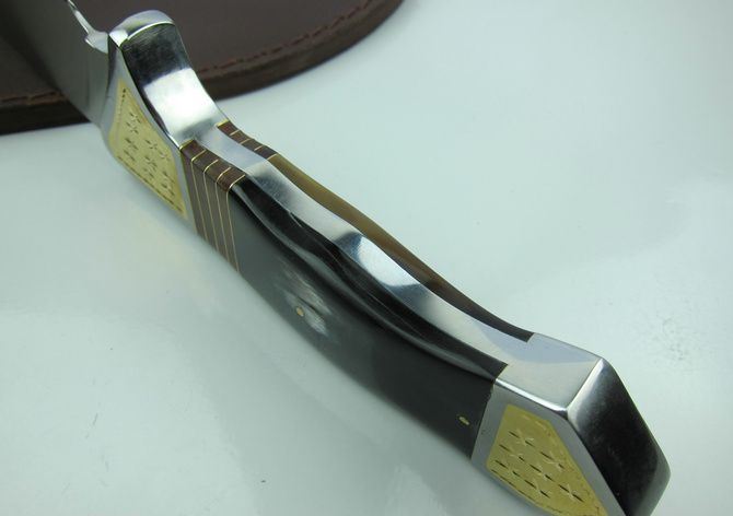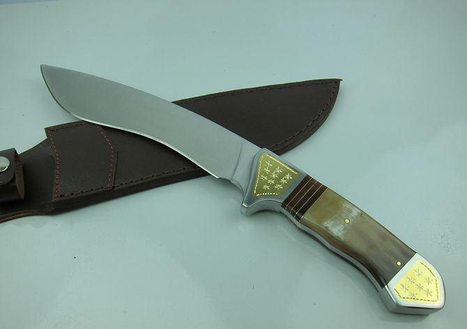 全长:36.2cm 刃长:20.1cm 柄长:15.2cm 刃宽: 5.5cm 刃厚:0.58cm 硬度区间:57HRC 全重:850g(含尼龙鞘和彩合) 刃材:440 表面:沙光 鞘材:真皮套套 柄材:钢头镶花纹铜片+牛角,制作工艺非常之高。 注:由于自然牛角每条色彩不同,要以实物为准.