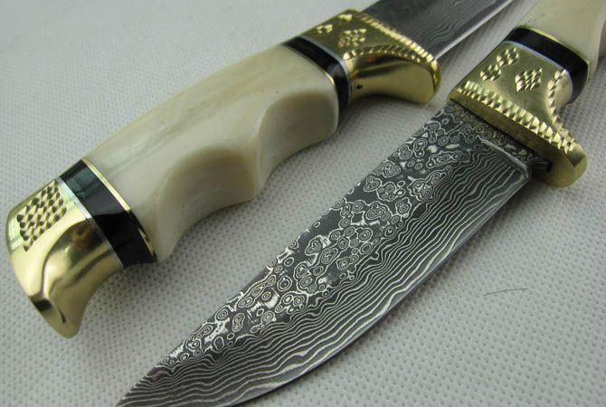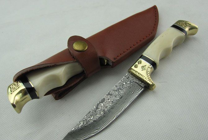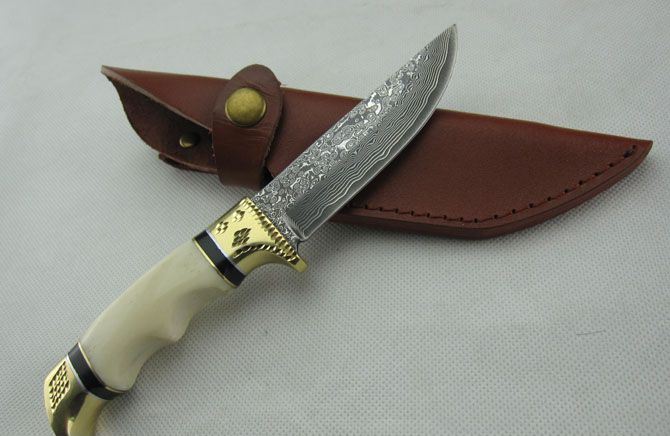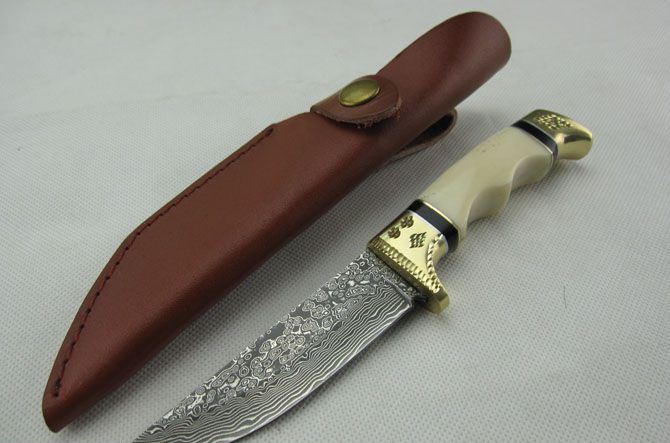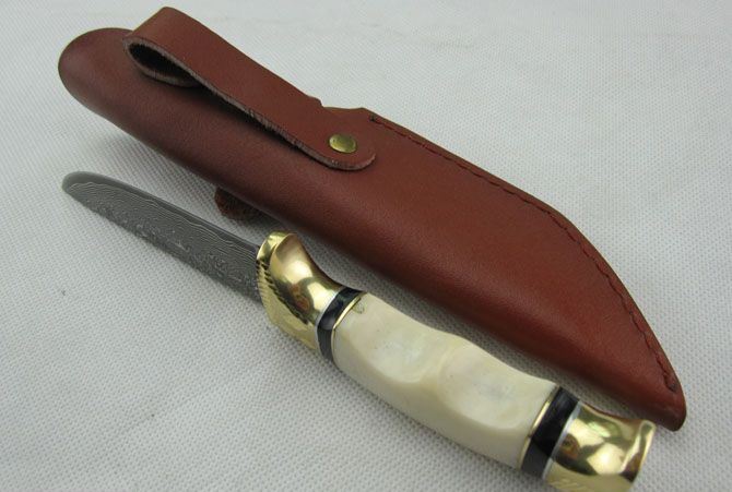 骆驼骨/雕花双铜头大马士革收藏猎刀 全 长:19cm 刃 长:9.0cm 柄 长:9.7cm 刃 厚:3.0mm 刃 材:大马士革钢 硬 度:58HRC 刀 柄:骆驼骨/雕花双铜头 表 面:大马士革花纹 重 量:280.0克(包括皮套) 备 注:带皮套
