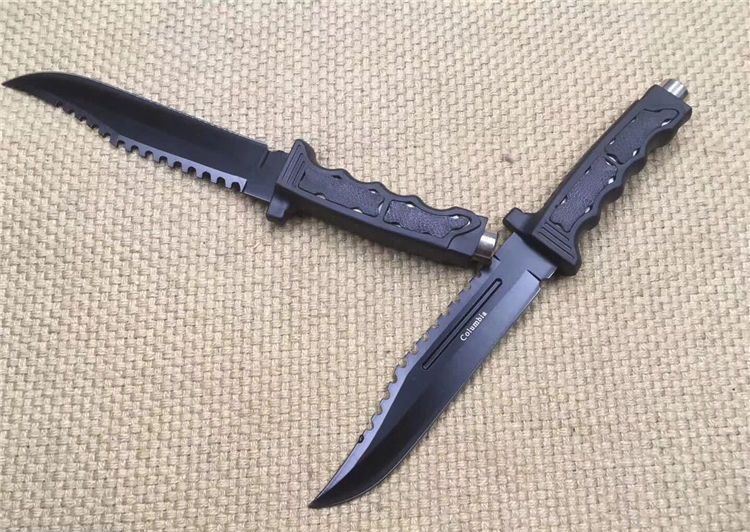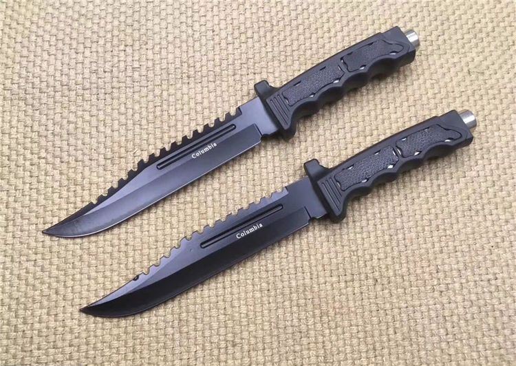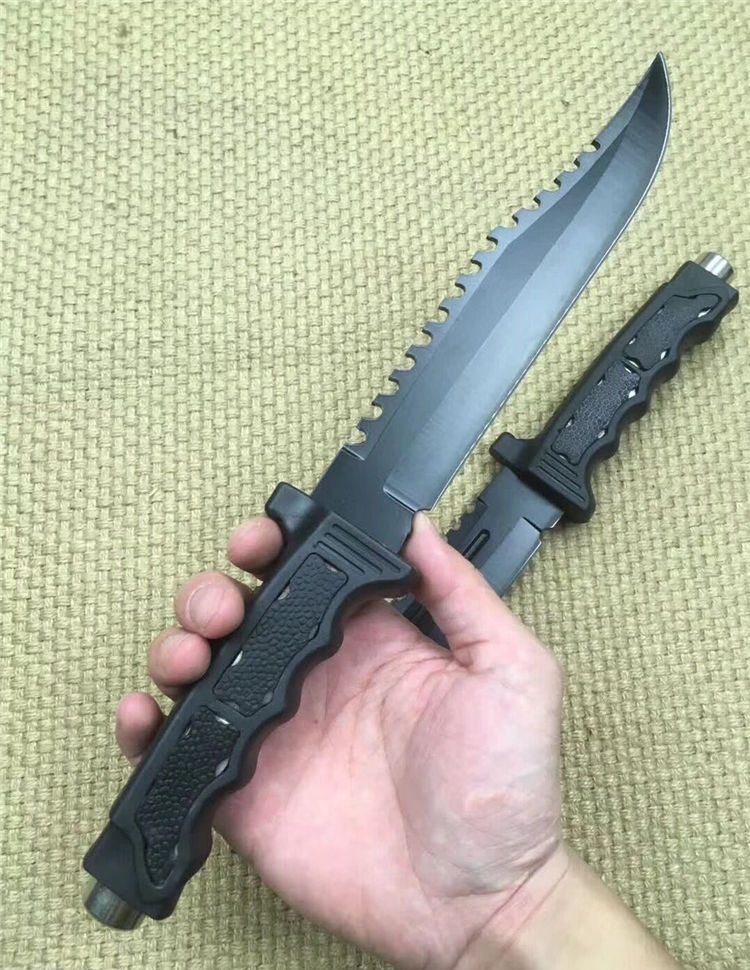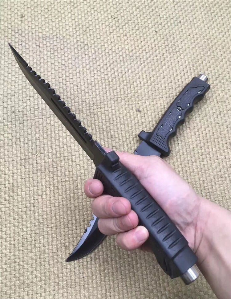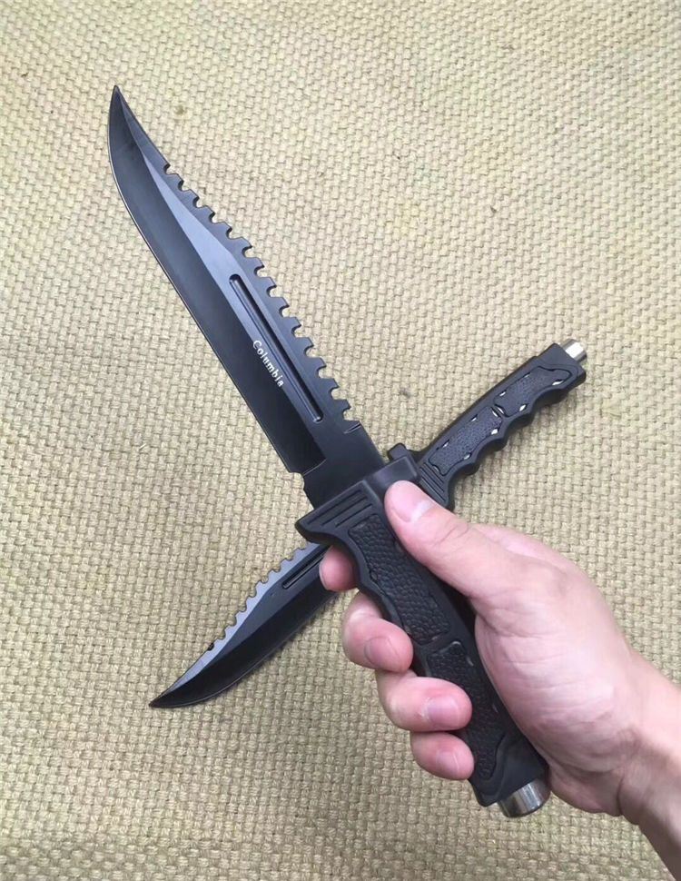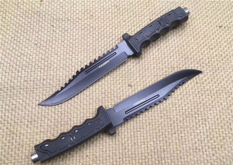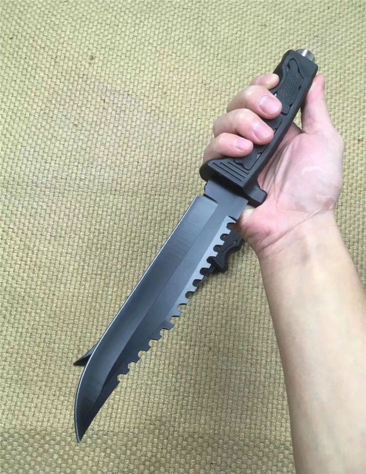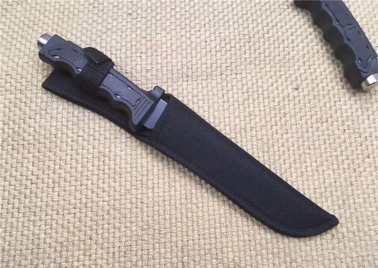 新版虎牙战斗刀 全 长: 31cm 刃 长: 17cm 刃 宽: 3.5cm(最宽处) 刃 材: 420 硬 度: 55 表 面: 黑漆 刃 厚: 0.4cm 柄 长: 12.5cm 柄 厚: 2.5cm 柄 材: 橡塑(手感很好) 重 量: 300克
