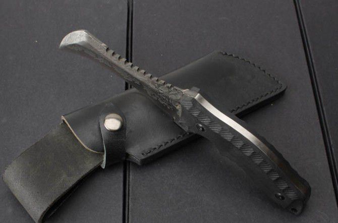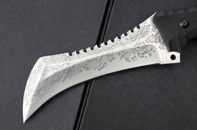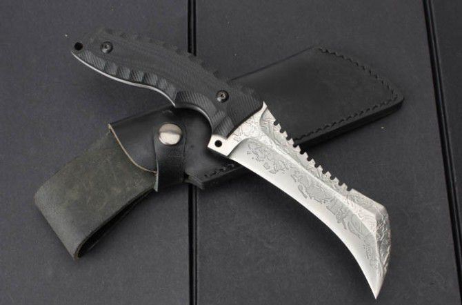 菊男鹰嘴爪子刀 全 长:32cm 刃 长:18.5cm 刃 厚:6mm 刃 材:440C 硬 度:58HRC 表 面:黑钛 柄 材:米卡塔 刀 鞘:牛皮套