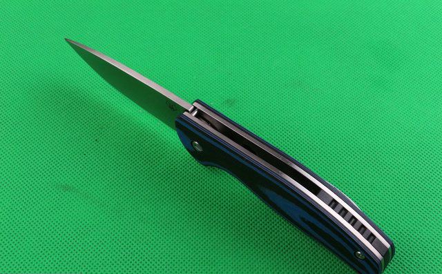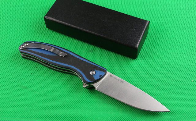 高端双色刀王折刀 全 长:22.0cm 刃 长:9.7cm 柄 长:12.8cm 刃 宽:3.2cm(最宽处) 刃 厚:4.7mm 刃 材:5CR15MOV 硬 度:57-59HRC 刀 柄:双色米卡塔。 表 面:平磨,直纹沙光 锁定方式:一体线锁 重 量:350克(含包装) 备 注:带背夹,刀身内置轴承。