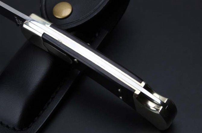全长:21.8 刃长:9.5 刃宽:2.1 刃厚:0.29 柄长: 12.5 刃材:440 硬度:57HRC 柄材:黄铜头+钢片+黑檀木 锁型:背锁 总重量:300(含包装物) 颜色:黑檀木柄、黄檀木柄 高档彩盒包装和优质牛皮套