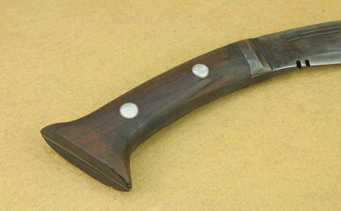 廓尔喀灰狼弯刀 全长:47cm 刃长:31cm 柄长:16cm 刃宽:5.3cm 刃厚:10mm 总重:1300g (含皮套) 刃材:高碳钢 刀套:原木包皮 柄材:红酸枝 硬度:59HRC 性能:半开刃