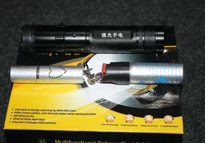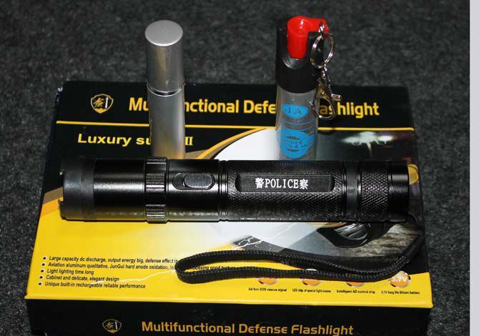 910安防二合一套装(强光电棍)黑色 全长:18.2CM 管宽:3.5CM 重量:205克 净重 输出电压:40万伏 电源方式:循环充电式 配 2支催泪喷雾