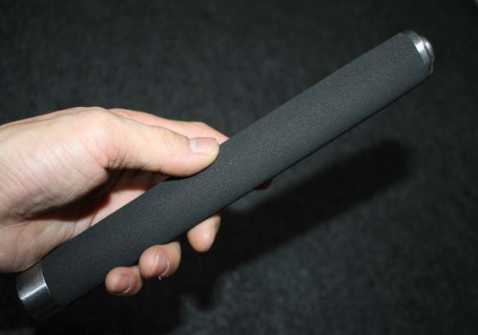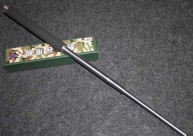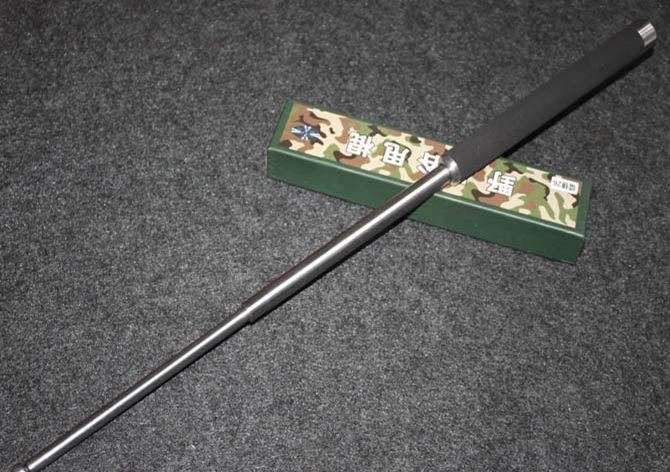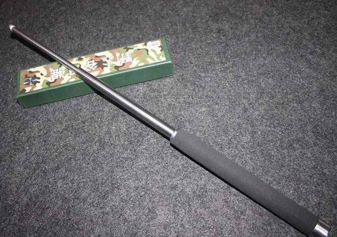 棍体材料:高强度合金钢, 硬度大概58HRC(经测试,能吊起一辆汽车以上的重量) 棍把材料:黑色乙烯基合成(防滑材质,不会因流汗潮湿而滑手) 收缩长:23.8 CM (便携隐蔽) 甩出长:62.5 CM (常用长度) 毛重: 634克(含包装) 表面: 硬铬银色(永不掉色) 包装: 纸盒+尼龙套 其他性能:钢卡式,专门在接口处精密处理,处理后甩出锁定牢靠, 收回时,朝地面垂直一磕就回去了。