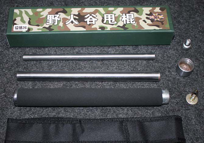 野人谷25寸碎石版合金甩棍 棍体材料:高强度合金钢, 硬度大概58HRC(经测试,能吊起一辆汽车以上的重量) 棍把材料:黑色乙烯基合成(防滑材质,不会因流汗潮湿而滑手) 收缩长:23.8 CM (便携隐蔽) 甩出长:62.5 CM (常用长度) 毛重: 634克(含包装) 表面: 硬铬银色(永不掉色) 包装: 纸盒+尼龙套 其他性能:钢卡式,专门在接口处精密处理,处理后甩出锁定牢靠, 收回时,朝地面垂直一磕就回去了。