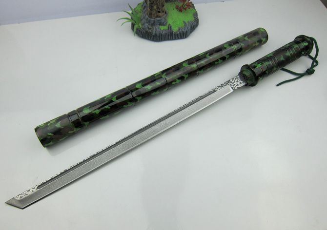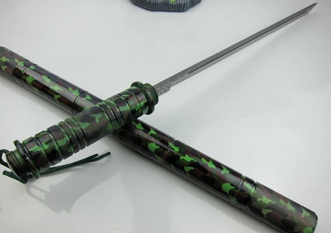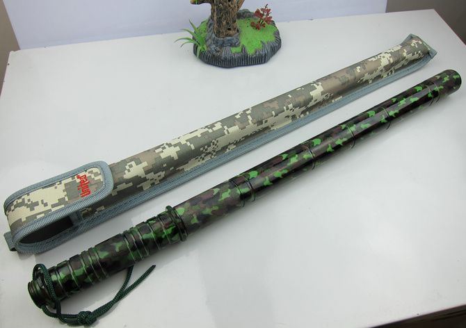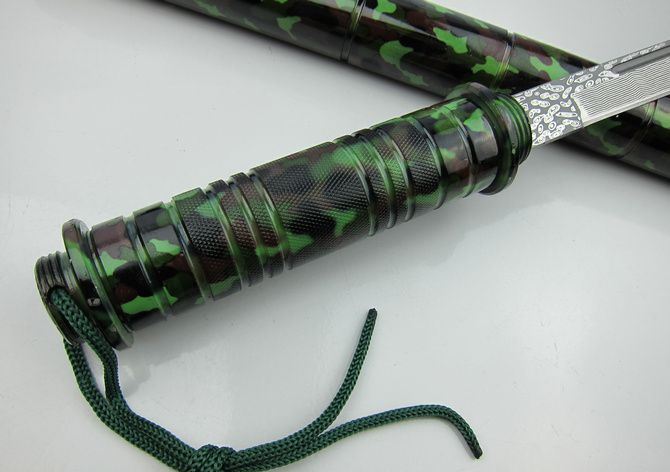 迷彩版-联合警棍刀(仿大马士革) 完全反接长度:95.5CM 刃长:36.5CM 完全正合长度:56.8CM 管径:3.25CM 刀厚:0.4CM 刃宽: 2.2CM 重量: 1100g 硬度: 56HRC 刀材质:440不锈钢,表面缴光纹大马士革纹 管材: 合金铝 柄材: 合金铝 表面:迷彩 其他:双面血槽,武士刀头 配件;原厂彩盒。高档耐磨加厚迷彩尼龙套