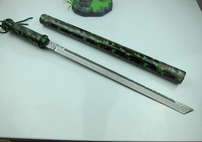 完全反接长度:95.5CM 刃长:36.5CM 完全正合长度:56.8CM 管径:3.25CM 刀厚:0.4CM 刃宽: 2.2CM 重量: 1100g 硬度: 56HRC 刀材质:440不锈钢,表面缴光纹大马士革纹 管材: 合金铝 柄材: 合金铝 表面:迷彩 其他:双面血槽,武士刀头 配件;原厂彩盒。高档耐磨加厚迷彩尼龙套