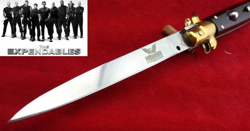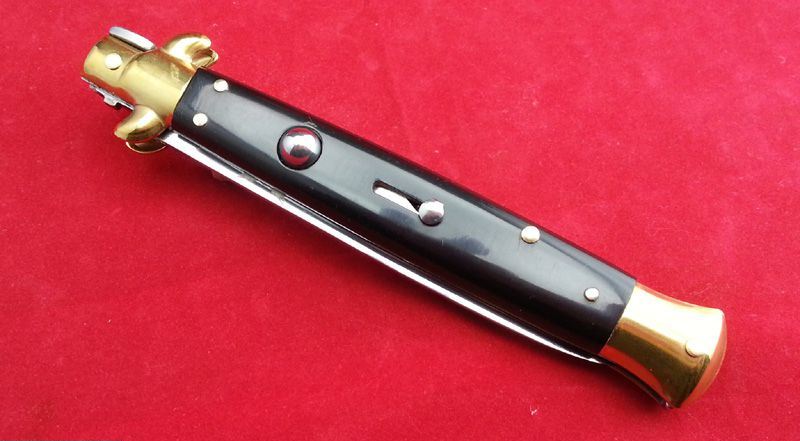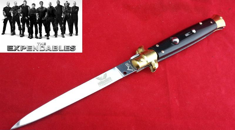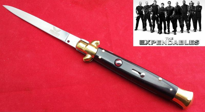 11“意大利AKC古典跳刀-(黑牛角小剑刃)敢死队定制款 全 长:28cm 刃 长:12.5cm 柄 长:15.5cm 刃 宽:1.3cm(最宽处) 刃 厚:3.0mm 刃 材:7铬17钼钒 刀 柄:天然黑牛角 表 面:镜光 开刀方式:弹簧 重 量:150克 260(毛重) AKC公司出品,《敢死队》电影收藏款式,性能优越,满足把玩和收藏的需要 意大利黑手党使用的经典刀具-赌徒跳刀,出刀迅速,锁定稳固,具有超强的穿刺力!带有保险装置,刀护手处暗藏闭合开关!