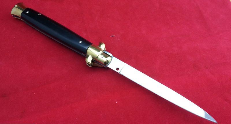 全 长:28cm 刃 长:12.5cm 柄 长:15.5cm 刃 宽:1.3cm(最宽处) 刃 厚:3.0mm 刃 材:7铬17钼钒 刀 柄:天然黑牛角 表 面:镜光 开刀方式:弹簧 重 量:150克 260(毛重) AKC公司出品,《敢死队》电影收藏款式,性能优越,满足把玩和收藏的需要 意大利黑手党使用的经典刀具-赌徒跳刀,出刀迅速,锁定稳固,具有超强的穿刺力!带有保险装置,刀护手处暗藏闭合开关!