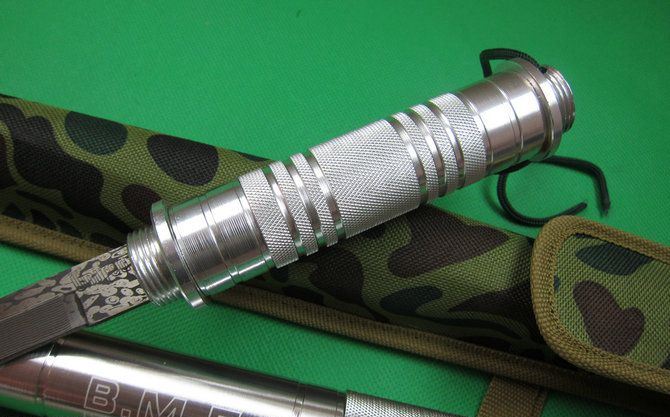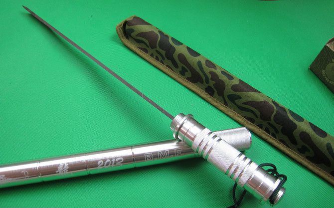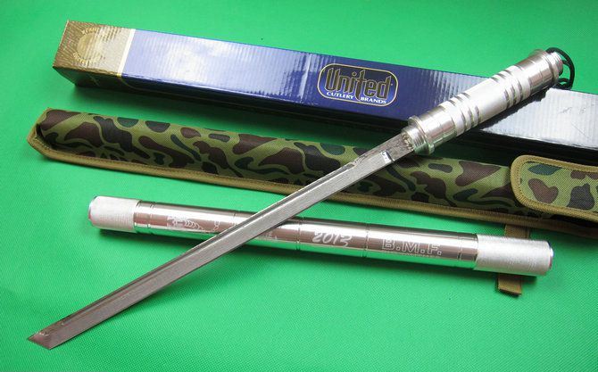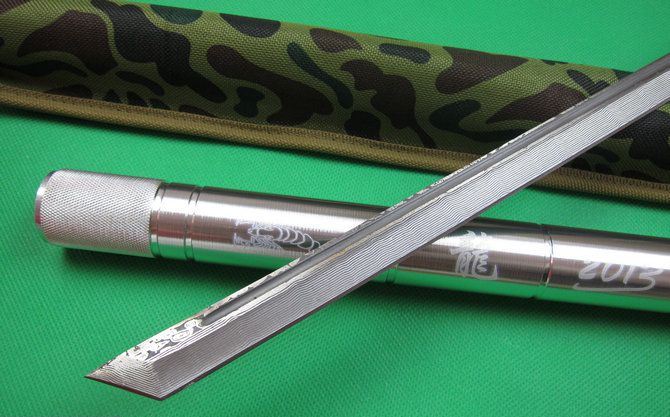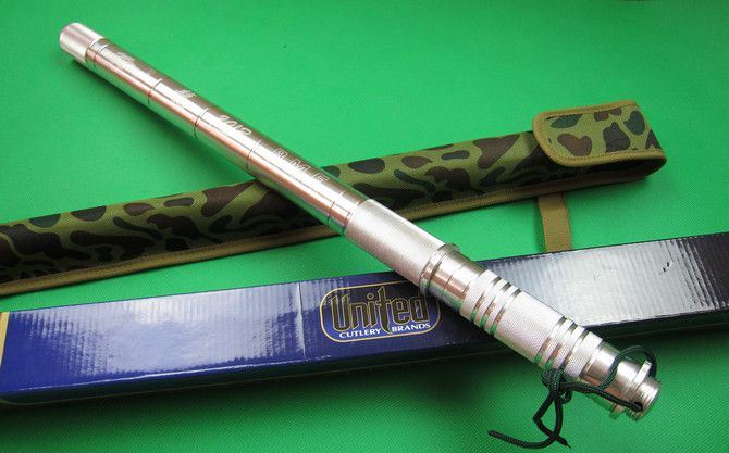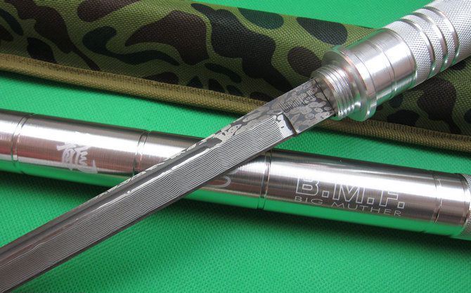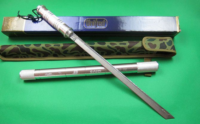 F4联合棍刀(2013缴光纹大马) 完全反接长度:95.5CM 刃长:36.5CM 完全正合长度:56.5CM 管径:3.25CM 刀厚:0.48CM 刃宽: 2.2CM 重量: 1000g 硬度: 56HRC 刀材质:440不锈钢,表面仿大马士革纹 管材: 合金铝 柄材: 合金铝 表面:银色(不易刮花) 其他:双面血槽,武士刀头 配件;原厂彩盒。高档耐磨加厚迷彩尼龙套
