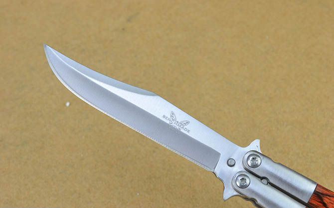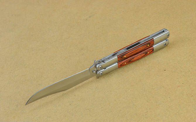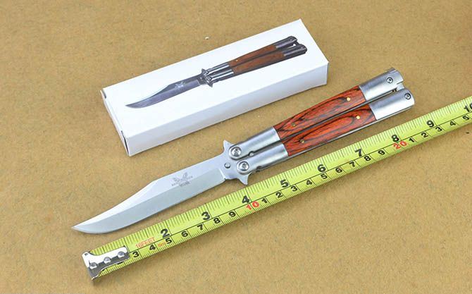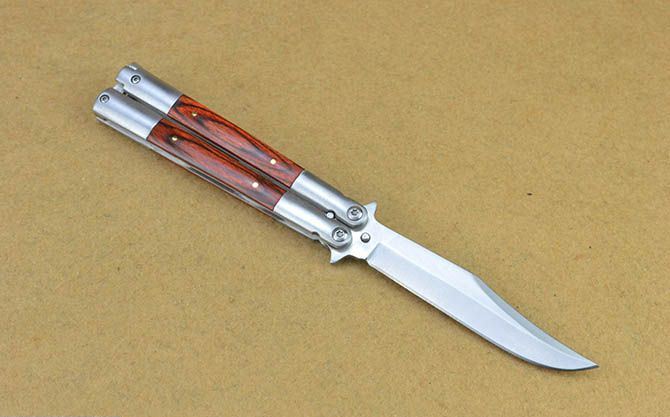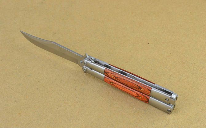 蝴蝶KELE彩木柄甩刀 全 长:22.3cm 刃 长:9.5cm 柄 长:12.3cm 刃 宽:2cm(最宽处) 刃 厚:2.8mm 刃 材:440 硬 度:54HRC 刀 柄:钢头+彩木 表 面:砂光 重 量:133克(含包装) 包 装:白盒
