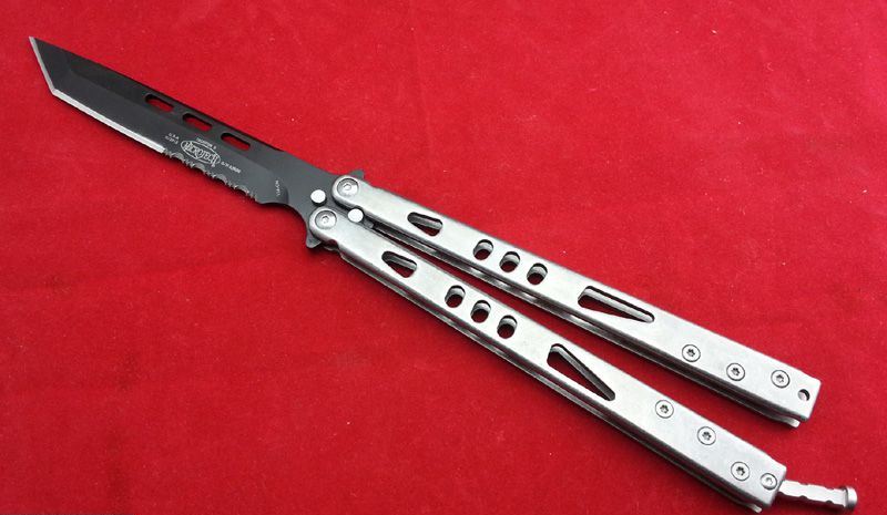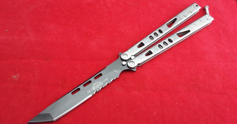 Microtech(微技术)蝴蝶甩刀-光速粒子Ⅱ TANTO黑半齿 全长:25.3 刃长:11.4 刃厚:0.38 刃材:440 柄材:石洗钢柄 柄长:13.8 重量:140克 Microtech(微技术)经典款蝴蝶甩刀-光束粒子,石洗柄,钛黑半齿,TANTO(短刀)型锋刃