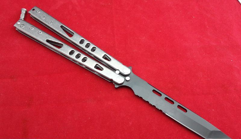全长:25.3 刃长:11.4 刃厚:0.38 刃材:440 柄材:石洗钢柄 柄长:13.8 重量:140克 Microtech(微技术)经典款蝴蝶甩刀-光束粒子,石洗柄,钛黑半齿,TANTO(短刀)型锋刃