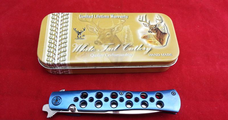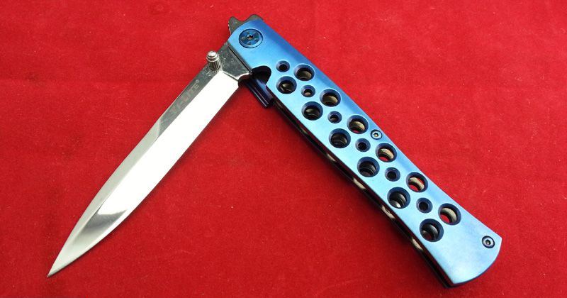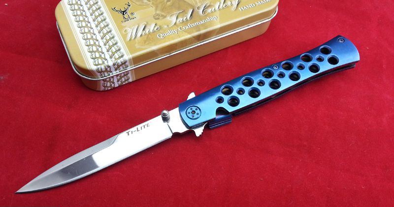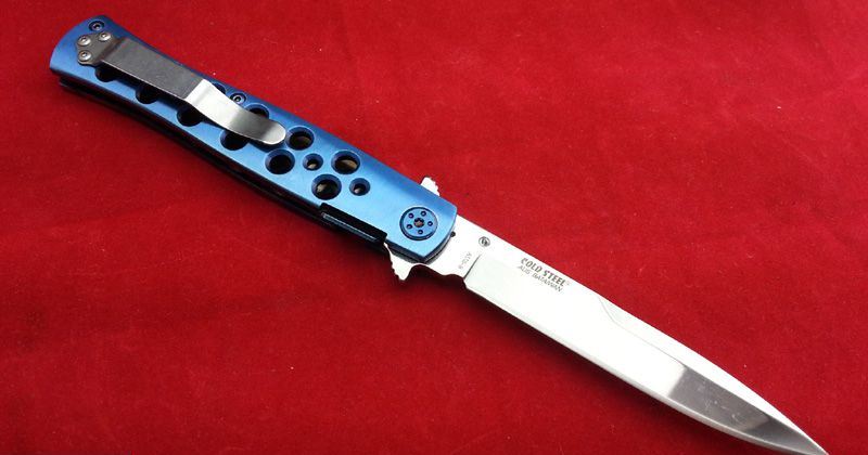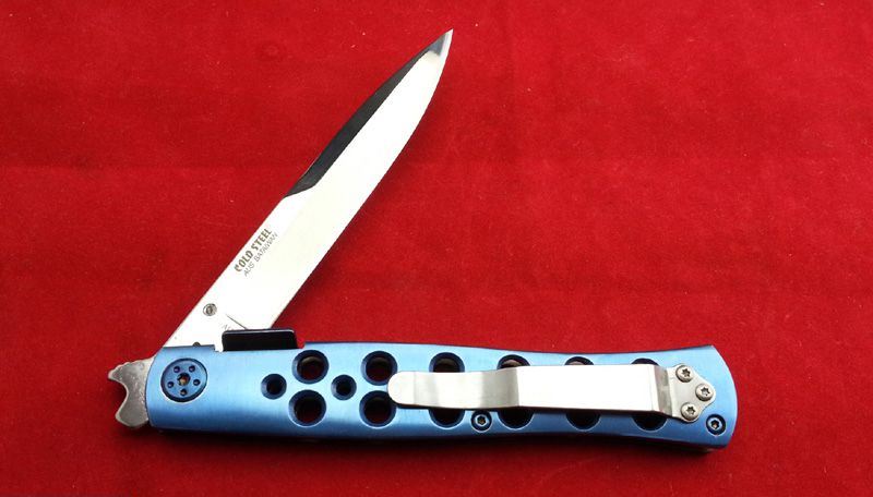 冷钢26S巴黎蓝 (精美礼盒)镜面款 全长: 22 刃长:10 刀柄:123 刀厚:0.3 重量: 150克 刃材料:AUS-8 硬度 57 刀锁:衬锁 表面:巴黎蓝 冷钢26S新款,英俊的梭子型刀身!,细长穿刺型刀刃,拥有强大的穿刺和切削能力,鲨鱼背鳍式的突起及刀刃上的拨钮结构,可以单手快速的开关刀。刀刃衔铁上设有护手的赌徒刀设计,内衬卡锁,向所有人提供了易于操作的优良性能