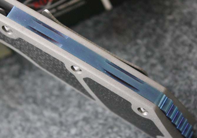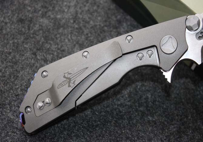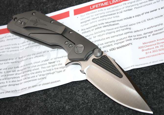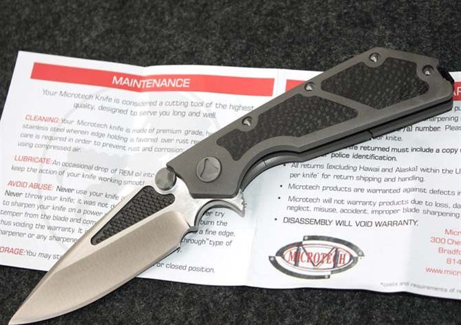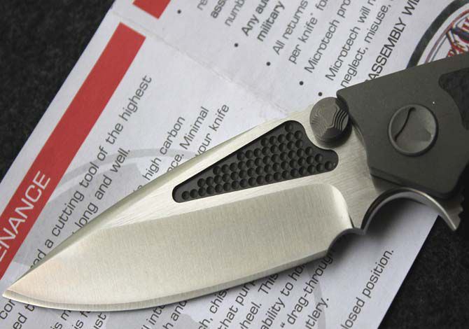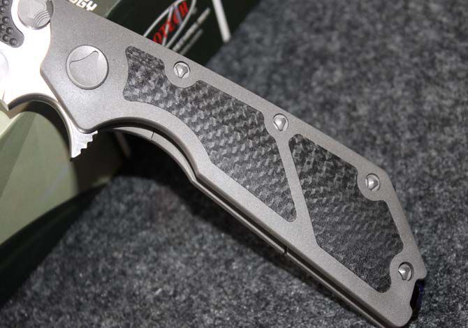 微技术DOC(死亡接触) 全长:228mm 刃长:90mm 柄长:130mm 刃宽:36mm 刃厚:5.0mm 刃材:D2(深冷处理) 重量:200g 硬度:58-60HRC 表面:拉丝+镀钛 柄材:TC4钛合金+碳纤 刀夹:TC4钛合金 锁型:分体插入锁杆式线锁。 螺丝:所有螺丝420不锈钢、硬度HRC45、全CNC精雕加工。 结构:分体插入锁杆式线锁结构、锁刀接触镶嵌合金粒、陶瓷定位珠、内置平面滚针轴承垫片。 其他:配彩合和出世纸
