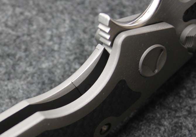 全长:228mm 刃长:90mm 柄长:130mm 刃宽:36mm 刃厚:5.0mm 刃材:D2(深冷处理) 重量:200g 硬度:58-60HRC 表面:拉丝+镀钛 柄材:TC4钛合金+碳纤 刀夹:TC4钛合金 锁型:分体插入锁杆式线锁。 螺丝:所有螺丝420不锈钢、硬度HRC45、全CNC精雕加工。 结构:分体插入锁杆式线锁结构、锁刀接触镶嵌合金粒、陶瓷定位珠、内置平面滚针轴承垫片。 其他:配彩合和出世纸