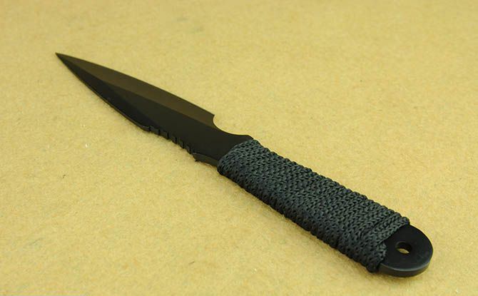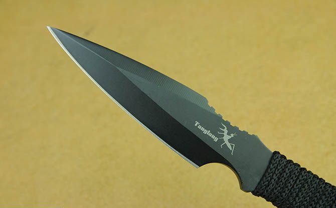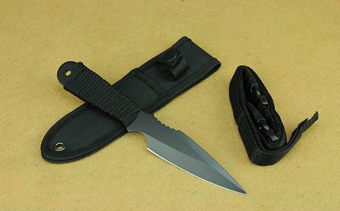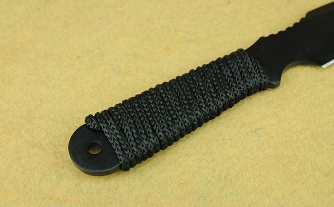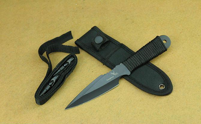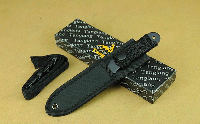 螳螂绑腿刀 全 长:21.8cm 刃 长:10cm 刃 宽:3cm(最宽处) 刃 厚:3.9mm 柄 长:9cm 表 面: 发黑 刃 材: 420 硬 度: 54HRC 柄 材: 龙骨一体,扎绳 重 量:198克(含包装) 包 装:彩盒+尼龙套+绑带