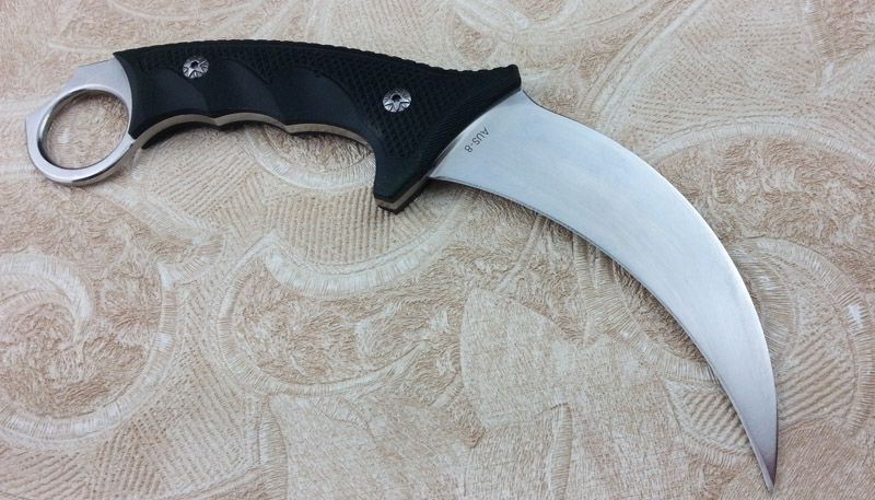 全长:21.6CM 刃长:10.16CM 刃材料:AUS-8 刃厚:4MM 净重:200g 毛重:250g 刀鞘:K鞘 原型冷钢cold steel 49ks,the one 手工版本,一体龙骨AUS-8 锋刃,坚固强悍,凌厉的镜面刀锋,搭配防滑G10手柄,舒适的手感,完美的爪型,使之成为最凶猛的近身搏击装备。