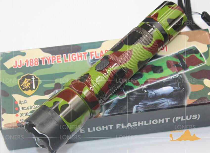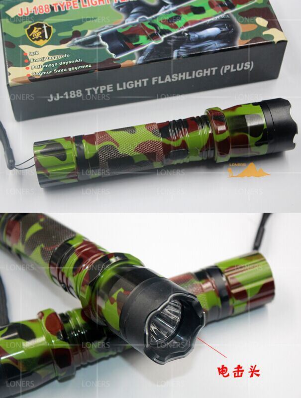 188迷彩强光电棍 特点: 1、采用航空钛合金外壳,高频振荡电流,高强度输出电流,大容量直流放电,输出能力巨大; 2、采用现役强光照明灯,既亮且照明时间长 3、采用内置式充电器,外观小巧,携带方便; 4、该电警棍外形独特,设计精美,是居家外出、防身自卫的理想佳品。 5、峰值电击电压:1200万伏 6、尺寸:长165mm 7、重量:180克
