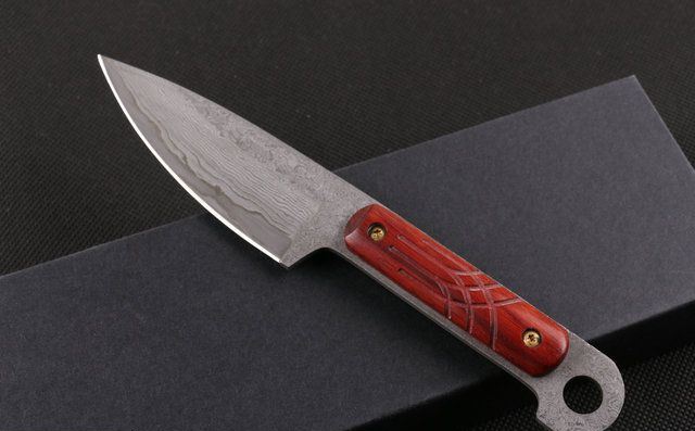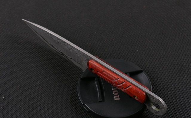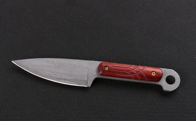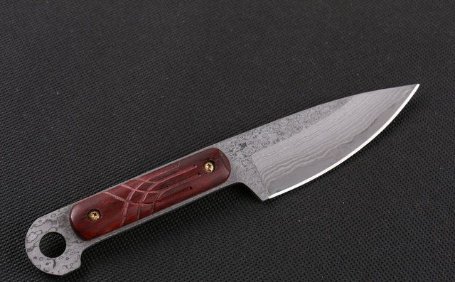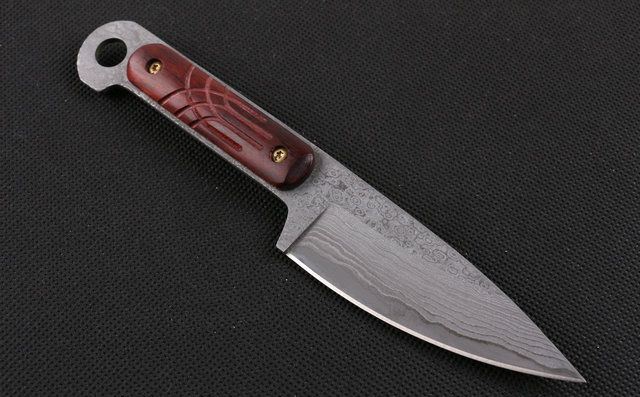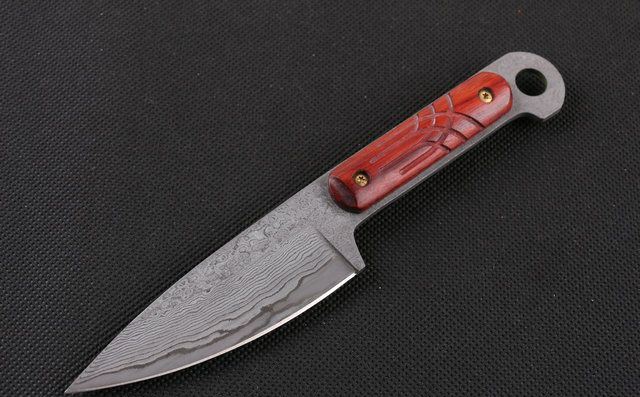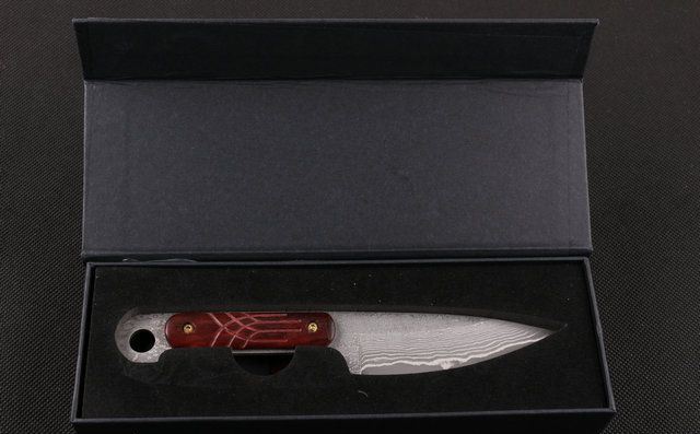 大马士革皇帝木 (小直) 全 长:18cm 刃 长:8.7cm 柄 长:8.8cm 刃 宽:3.0cm(最宽处) 刃 厚:2.8mm 刃 材:大马士革 硬 度:56-58HRC 刀 柄:红檀 表 面:原有大马士革纹 重 量:200克(含包装) 备 注:原厂礼品盒