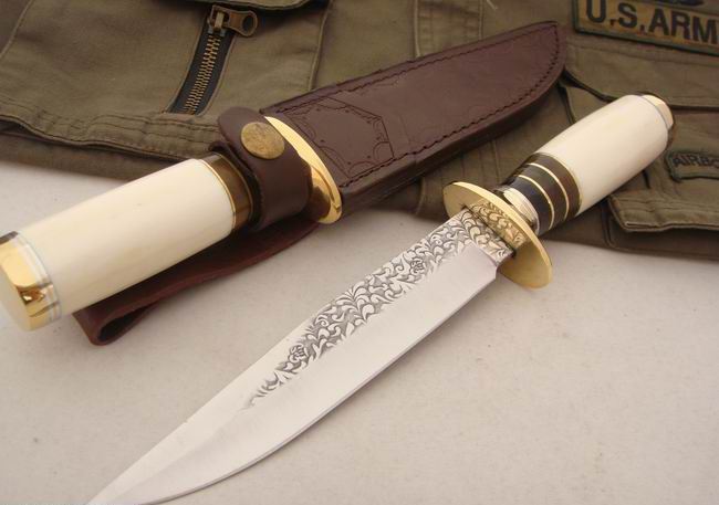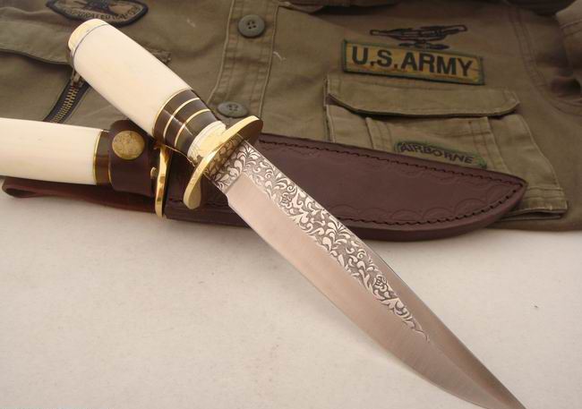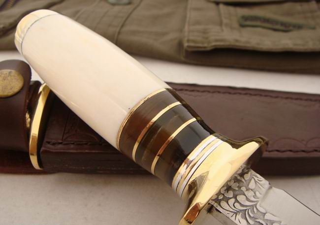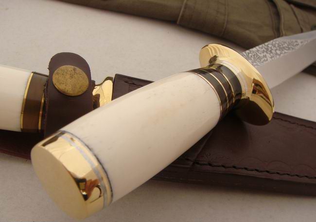 全长:26cm 刃长:15cm 刃宽:2.8cm 刃厚:0.42cm 刃材:7铬钢材 硬度:59HRC (高硬度;有些网站虚标65HRC的硬度,是欺骗刀迷的行为!) 表面:锻打,手工水磨 柄材:黄铜+牛角+兽骨 柄长:9.8cm 重量:360克(含皮套) 刀鞘:牛皮刀套