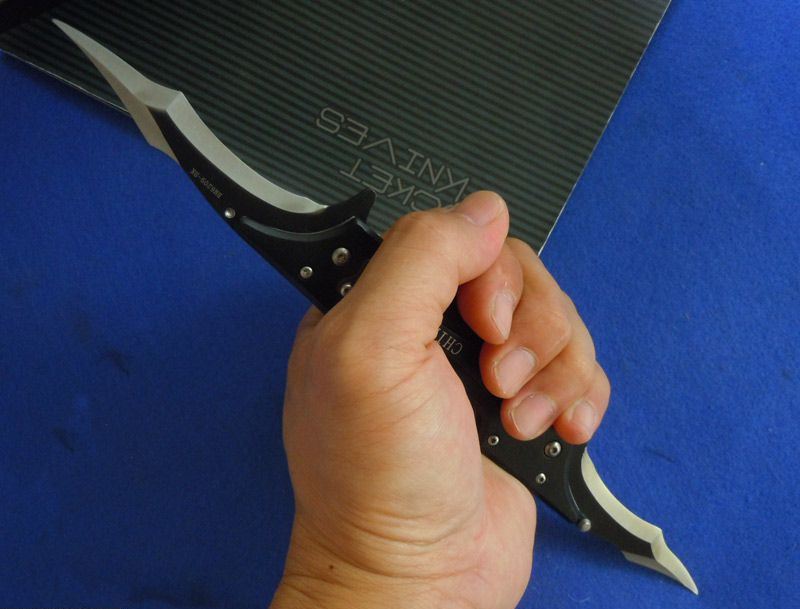 全长:28CM 刃长:9CM 刃厚:0.25CM 刃材:3铬13 柄材:铝(氧化蓝) 重量:160克 蝙蝠侠-黑夜骑士之双刃战刀,双刃如同蝙蝠之双翅,自动打开,好莱坞经典电影蝙蝠侠收藏系列