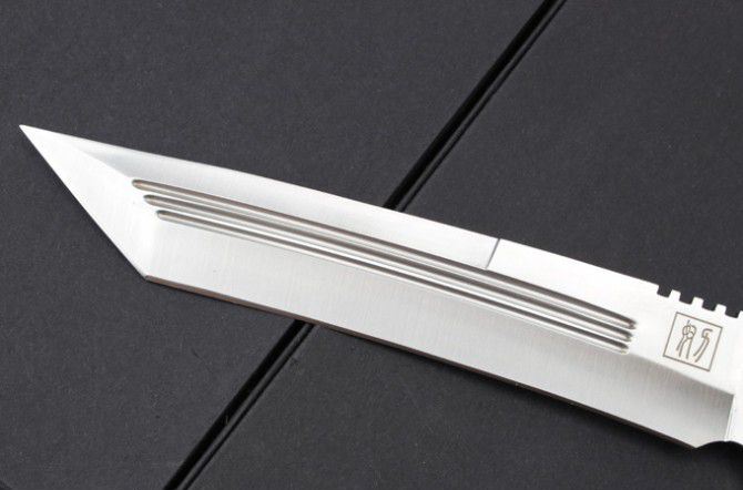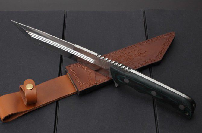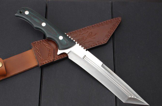 全 长: 36.5cm 刃 长: 21.5 刃 宽: 4cm(最宽处) 柄 长: 16cm 刃 厚: 0.6cm 刃 材: 440 硬 度: 57RHC 表 面: 丝光 柄 材: 刀身贯穿刀柄,三口坚实的钢钉铆住两面黑木 净 重: 574克(含套) 其 他:几何头三血槽刀身,刃口锋利;龙骨结构,真皮压花刀套。 品 质:高品质