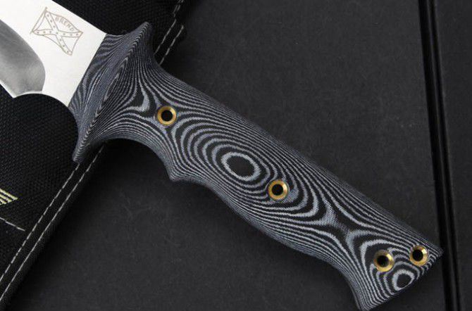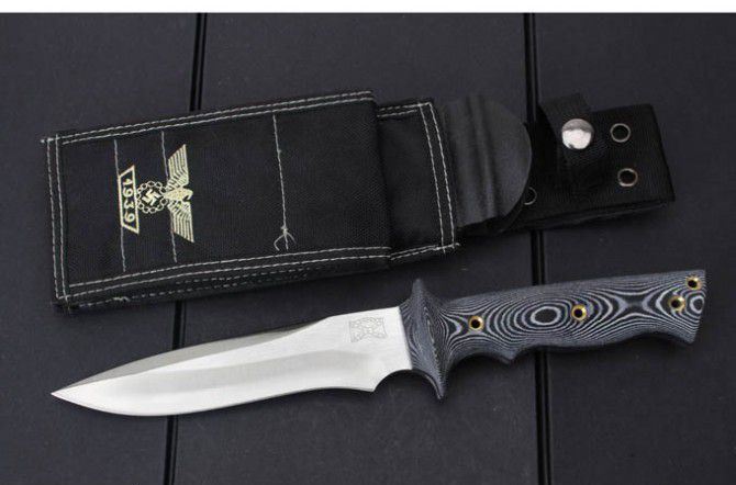 新款布兰登M2(护手版) 全长:30cm 刃长:16cm 柄长:14cm 刃厚:6mm 刃宽: 3.5cm 刃材: 8Cr13 柄材: 米克塔 硬度: 56HRC 净重:395克 毛重:820克 表面处理:手工砂光 其他:配硬纸盒
