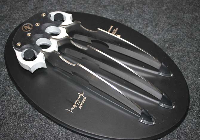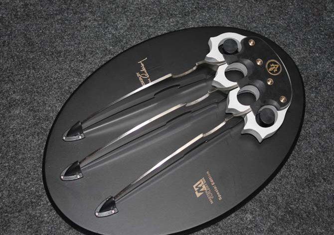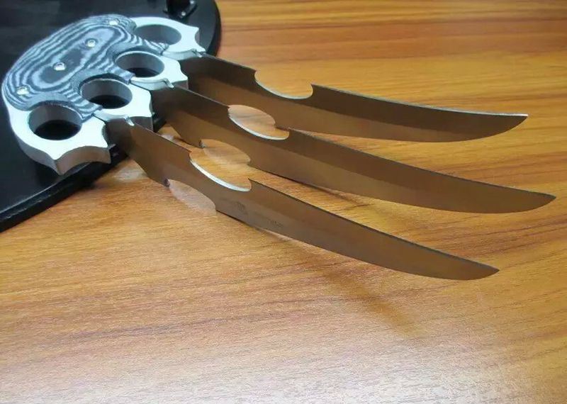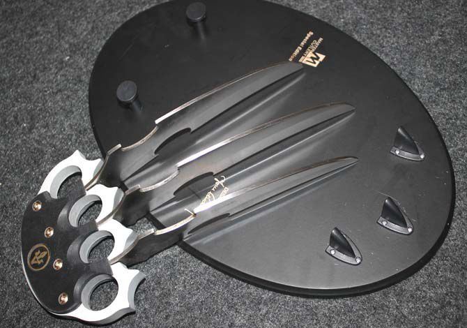 2015新款X战警-金刚狼2号 全长:28CM 刃长:17CM 刃厚:0.3CM 刃宽:4CM 刃材:5CR 刃硬:58HRC 刃表面:沙光 柄材:米克塔+铝氧化 柄长:9CM 柄宽:13CM 柄厚:2CM 净重:506G 毛重900G 包装:彩盒+挂盘