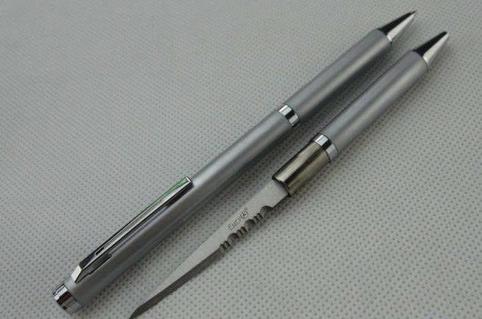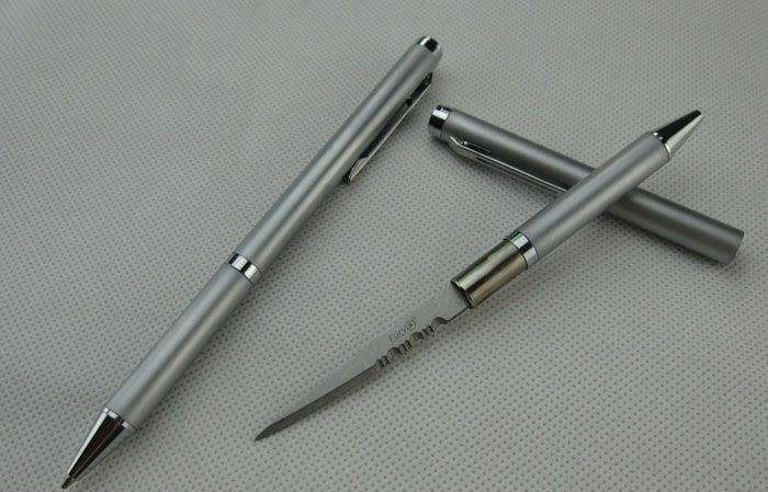 001A多功能圆珠笔刀(银色半齿) 非常实用的时尚礼品:多功能刀笔. 功能一:小刀(女子防身) 功能二:开信刀 功能三:圆珠笔 全长:13.5CM 净重:20.0克 在拔出小刀时请小心! 笔杆材料:铜