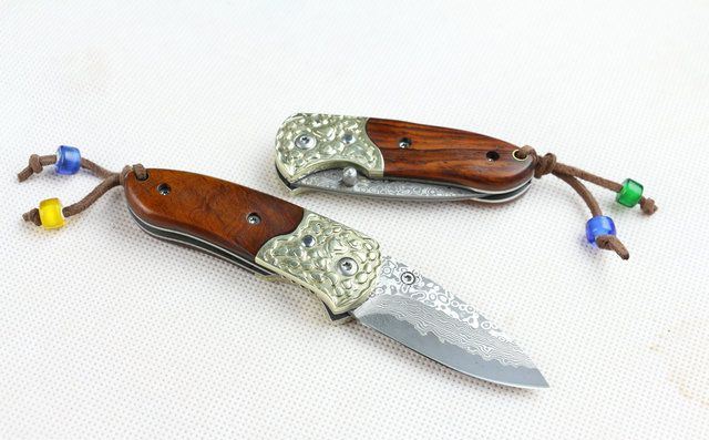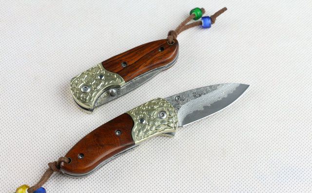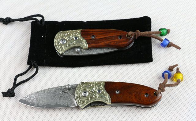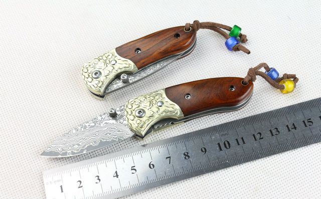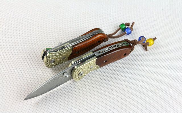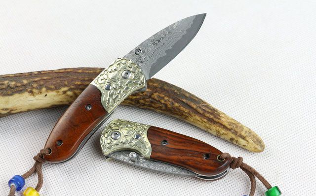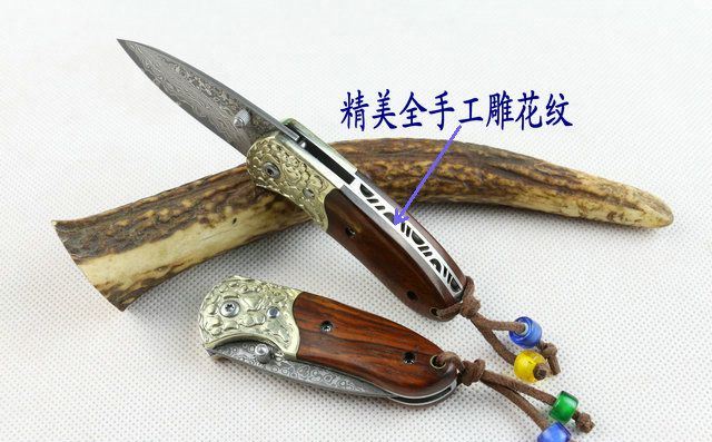 全 长:125mm 刃 长:52mm 柄 长:75mm 刃 宽:20mm 刃 厚:2.0mm 刃 材:大马士革钢 重 量:100g (含包装) 硬 度:58-60HRC 表 面:原有大马士革纹 柄 材:雕花纯铜+天然红檀手柄,木纹纹路清楚. 锁 型:线锁。 其 它;黄盒+黑绒套包装.红檀木和钢片之间不会有空隙,是刀匠做好刀的可见之处.