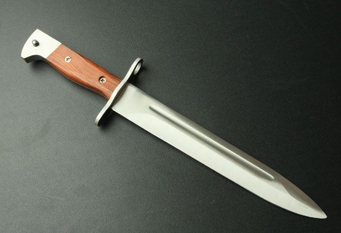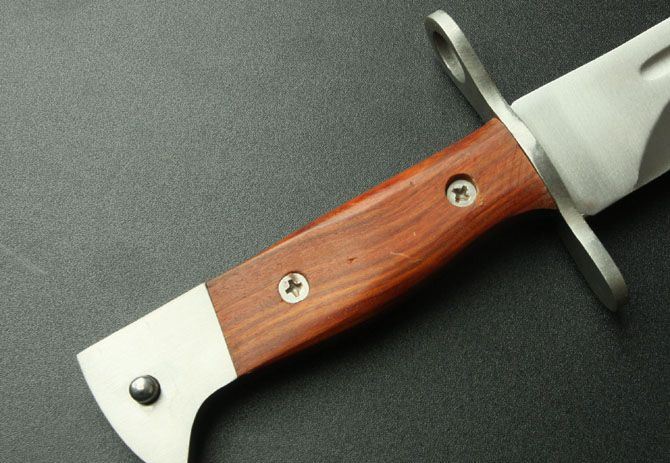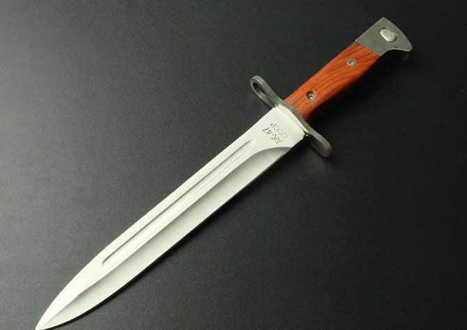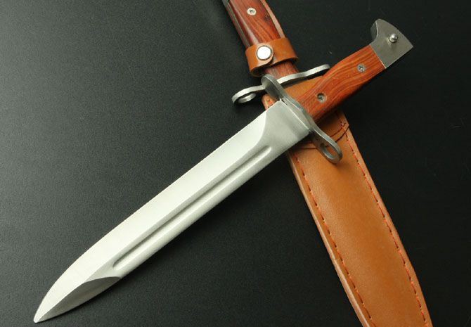 苏联AK47军刺(中号) 刀柄用花梨木包夹, 尾端有卡槽和锁卡,制造精良。 全长:34.3CM 净重:350g 厚度:0.32CM 刃材: 440高碳钢 硬度: 54HRC 附送皮革刀套