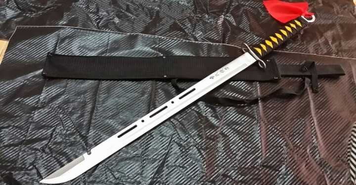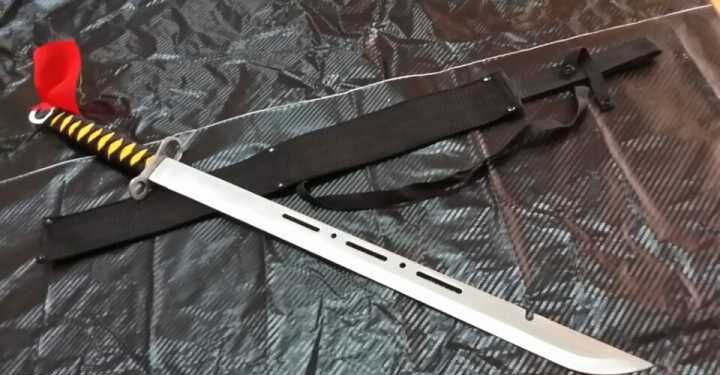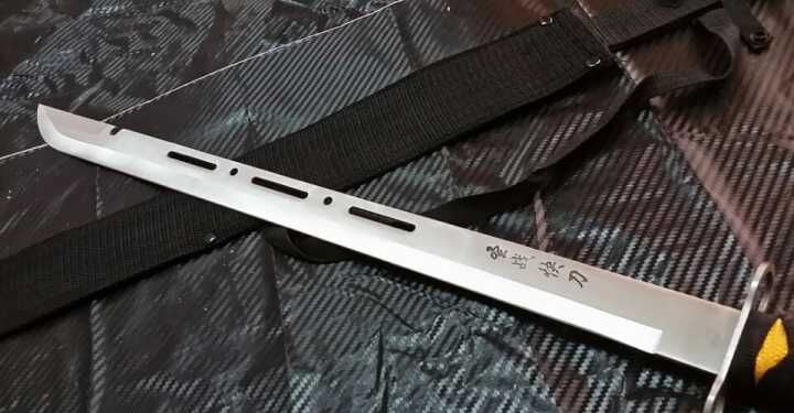 忍者快刀(尖头) 全长:70.5cm 刃长:46cm 柄长:21cm 刃厚:0.3MM 总重:385克 刃材:420高级不锈钢 硬度:53-55 刀套:尼龙面料