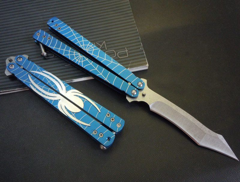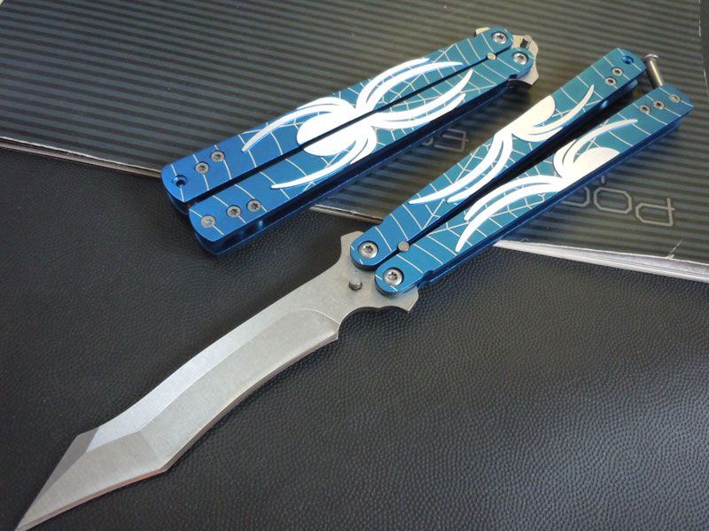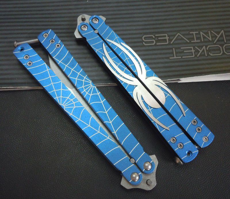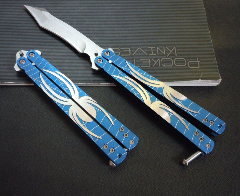 蓝蜘蛛蝴蝶甩刀 全长:22CM 刃长:10CM 刃厚:0.3CM 材料:3铬13不锈钢,表面石洗 柄材料:铝合金,巴黎蓝,压花,激光蜘蛛网 重量:70克 精品类甩刀,铝合金甩柄,压制出蜘蛛和蜘蛛网(激光),维妙维肖!刀刃象蜘蛛的长吻!石洗表面,刃口锋利,转动轻盈!棘齿型防松螺丝,不用加胶水,随意调节,设计合理!是练手最佳选择!