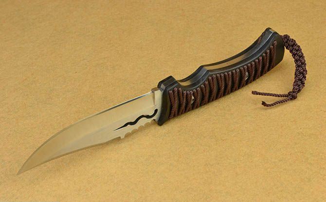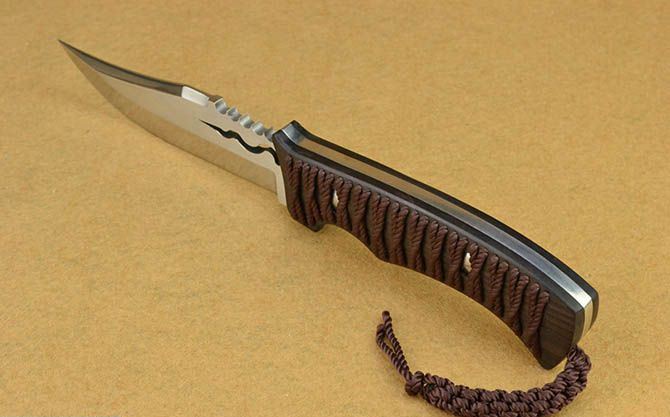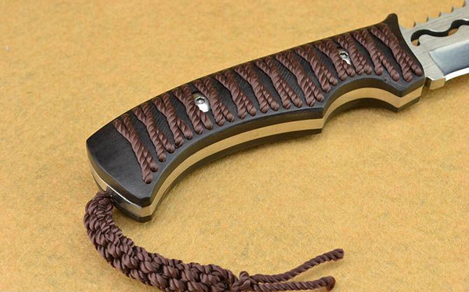 蛇君直刀 全 长:15cm 刃 长:12cm 刃 宽:3.3cm(最宽处) 刃 厚:5mm 柄 长:13cm 表 面:镜光+丝光 刃 材:7CR17 硬 度:58HRC 柄 材:黑檀穿孔绑绳 刀身贯穿刀柄一体龙骨结构 重 量:335克(含包装) 包 装:皮套