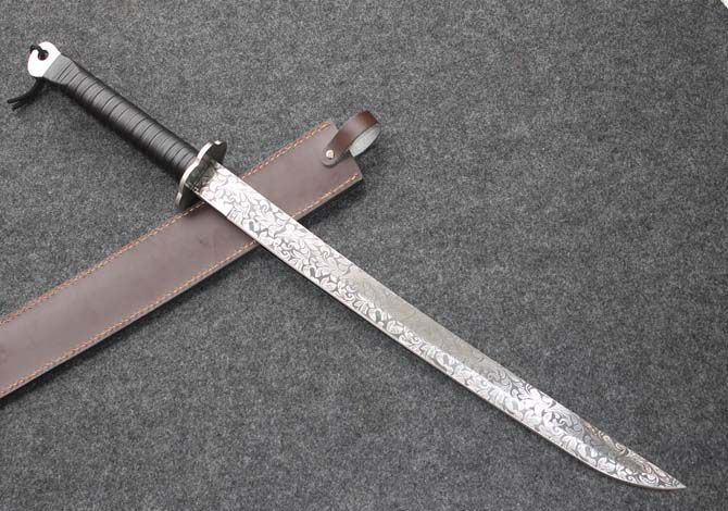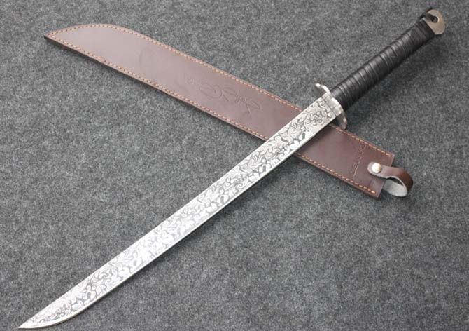 全长:78CM 刃长:54CM 刃材:5Cr13 硬度: 57HRC 刃厚: 0.57CM 刃宽:3.7CM (最宽处) 柄长: 24CM 柄材: 扎皮 刀鞘:皮套 重量:1350g