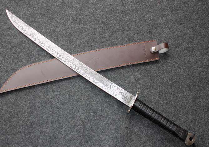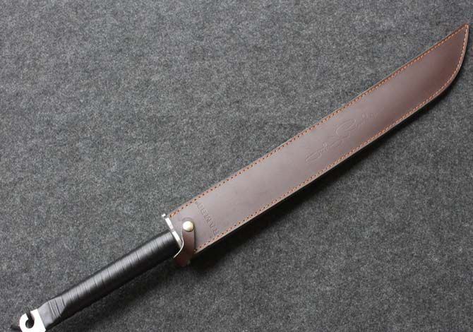 兰博菊花长刀(78cm) 全长:78CM 刃长:54CM 刃材:5Cr13 硬度: 57HRC 刃厚: 0.57CM 刃宽:3.7CM (最宽处) 柄长: 24CM 柄材: 扎皮 刀鞘:皮套 重量:1350g