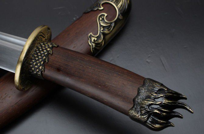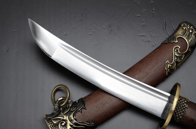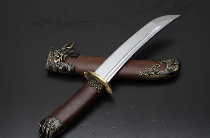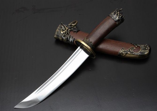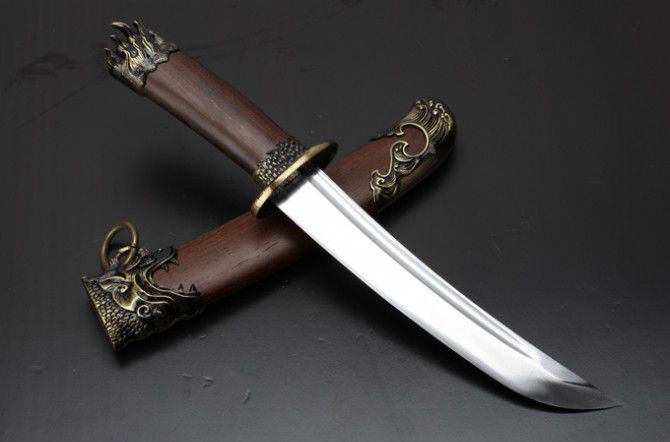 中华吉祥龙(高碳钢) 全长:32 厘米 刃长:18.5厘米 柄长:11.5 厘米 刀宽:2.8 厘米 厚度:0.49厘米 材质:高碳钢 工艺:古法淬火,回火,等热处理.全手工锻造,四面手工精细研磨,开刃. 硬度:58HRC 刀套:花梨木 柄材:花梨木 净重:660克(含包装) 附件:高档锦盒