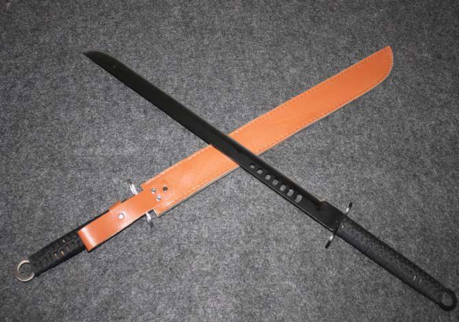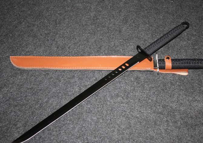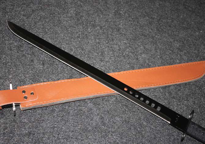 全长:70CM 刃长:50CM 刀厚:0.5CM 刀材质:420不锈钢 重量:0.73KG 硬度:56HRC 表面处理:黑色 手柄扎带 皮革套