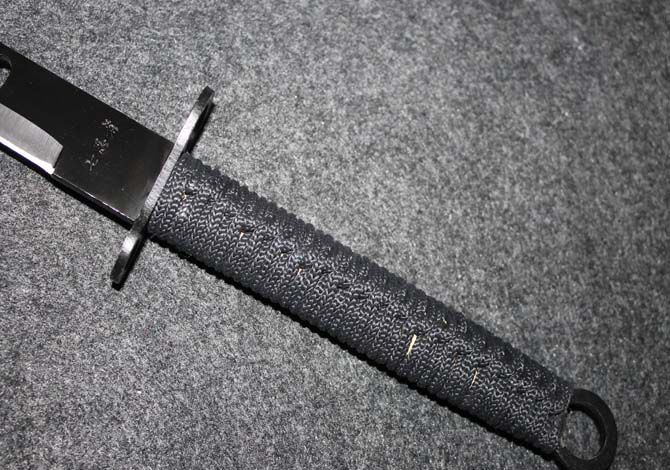 七忍者武士刀 (黑版) 全长:70CM 刃长:50CM 刀厚:0.5CM 刀材质:420不锈钢 重量:0.73KG 硬度:56HRC 表面处理:黑色 手柄扎带 皮革套