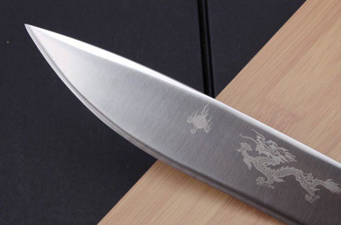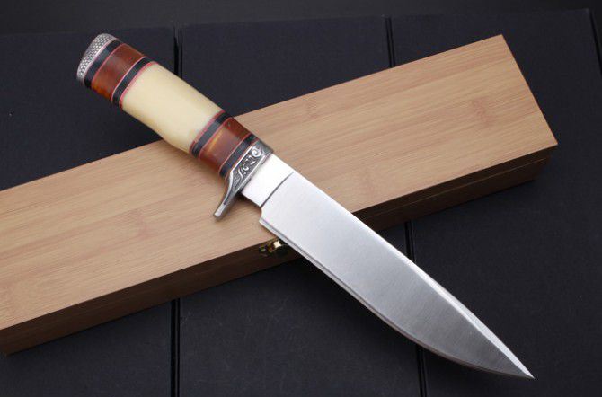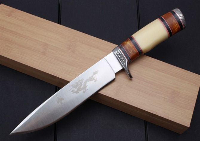 刀奴腾龙(大号) 全 长:350mm 刃 长:214mm 柄 长:134mm 刃 宽:40mm 刃 厚:5.8mm 刃 材:7Cr17 重 量:1032g(含包装) 硬 度:57HRC 表 面:砂光 柄 材:钢头+仿玉树脂 +碳纤维板 锁 型:定锁 其 他:配竹盒和皮套