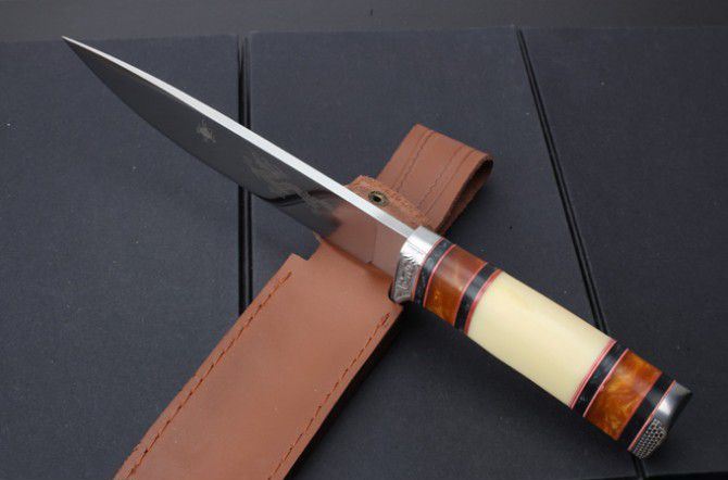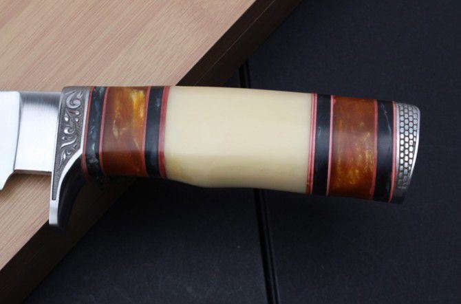 全 长:350mm 刃 长:214mm 柄 长:134mm 刃 宽:40mm 刃 厚:5.8mm 刃 材:7Cr17 重 量:1032g(含包装) 硬 度:57HRC 表 面:砂光 柄 材:钢头+仿玉树脂 +碳纤维板 锁 型:定锁 其 他:配竹盒和皮套