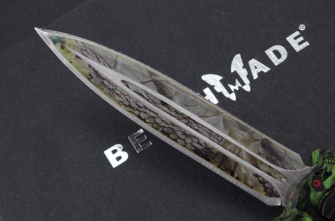 新版133双锋蝴蝶刀 全 长: 23.5cm 刃 长: 9.6cm 刃 厚: 1.8mm 刃 材: 440 硬 度: 57HRC 刀 重:200g 表 面:迷彩钢 柄 材: 锌铝合金 刀 鞘: 尼龙 锁 闭:直出弹簧刀