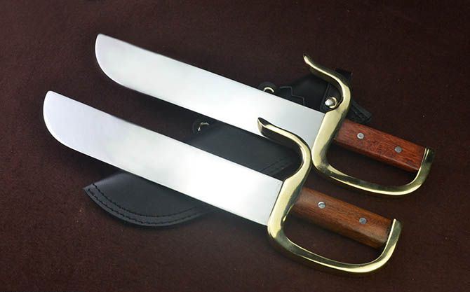 中号咏春八斩双刀(不开刃) 全长:40.5cm 柄长:10cm 刃长:28cm 刃宽:5.5cm左右(最宽处) 刃厚:0.3cm 两把总重:2000g(含皮套) 【刃材】 全钢超镜光 【工艺】抛超镜光 【硬度】 56左右 (HRC) 【鞘材】 皮套 【护手】 黄铜 【手柄】 红酸枝 【其他】 手工产品,稍有差别,请以实物为准