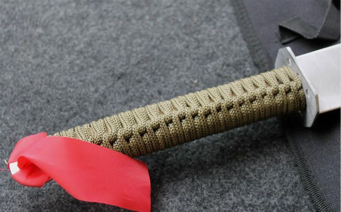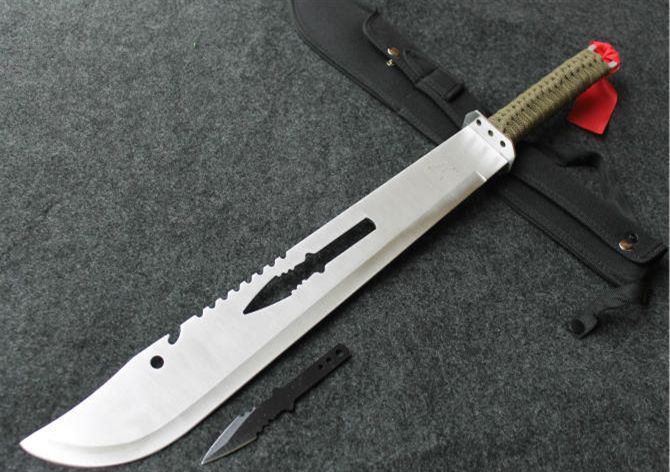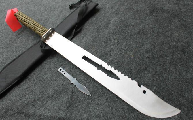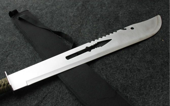 小镖关刀开山刀 全 长: 69.5cm 刃 长: 43cm 刃 宽: 5.8cm(最宽处) 刃 材: 420 硬 度: 55 表 面: 砂光 刃 厚: 0.3cm 柄 长: 21.5cm 柄 材: 绕带 重 量: 830克 尼龙鞘